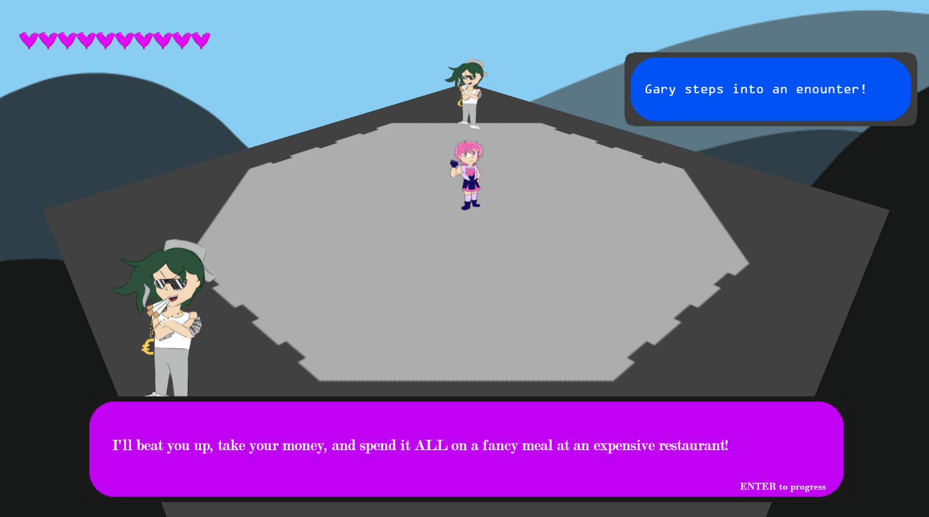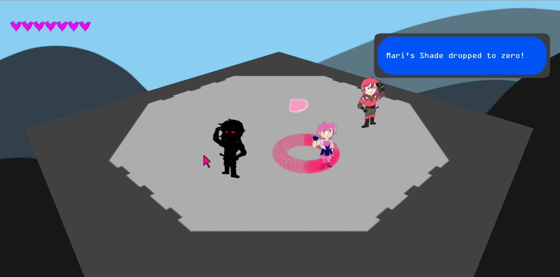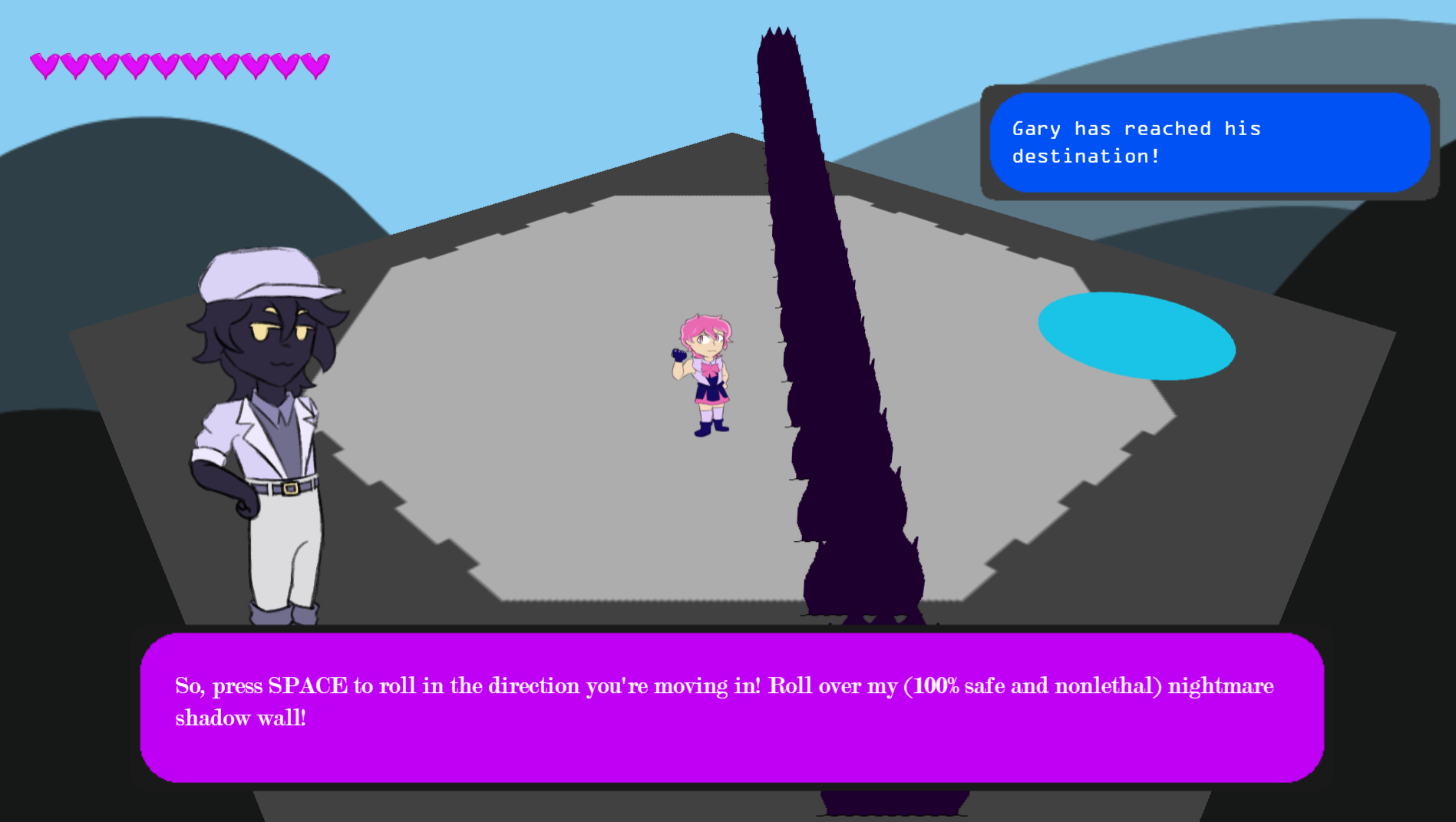 A game where you dodge and fight through a variety of bosses to reach to the end. Avoid cars, bombs, and nightmare shadow flames with your trusty dodge roll! If you learn a boss' patterns and time your attacks and dodges accordingly, you will be invincible.