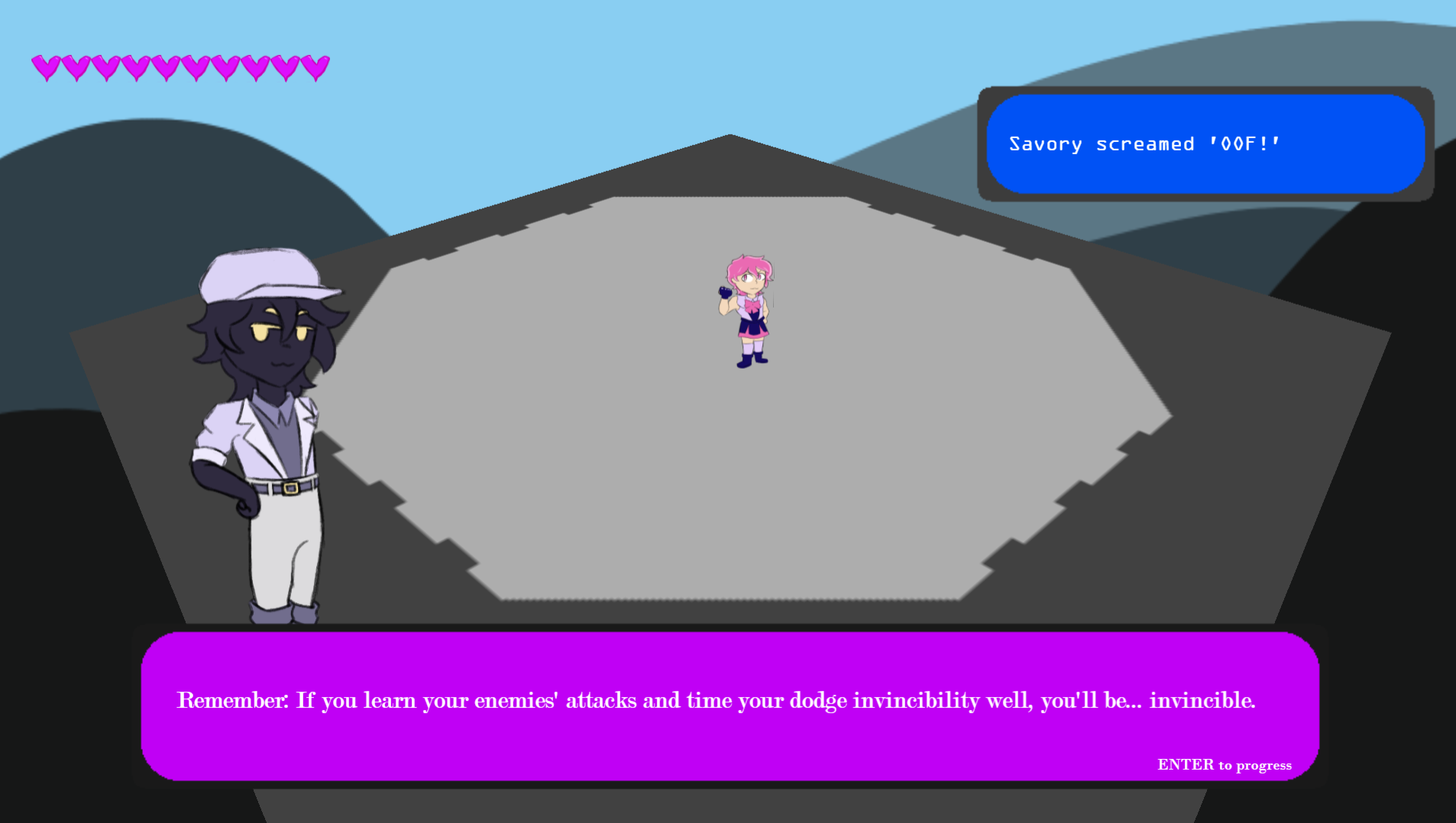 Progress dialogue with Enter. Move with WASD or Arrow Keys. Press Space to dash in the direction you're moving. Left-click to attack. If your attack's melee radius hits, it does triple damage, but if not, you fire a long-range projectile.